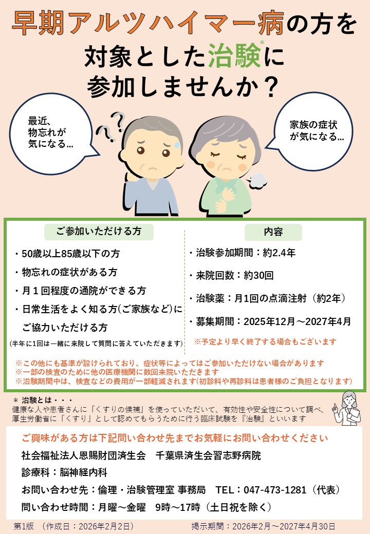 | 脳神経内科 | 早期アルツハイマー | 2025年12月~2027年4月 | ||||||||